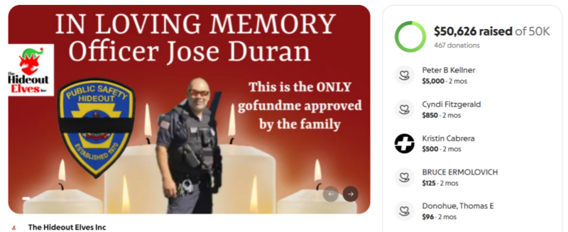 A few days after the tragedy, two fundraisers were launched to support Officer Duran’s wife, young child, and two adult children. One of these efforts was a GoFundMe campaign organized by The Hideout Elves.