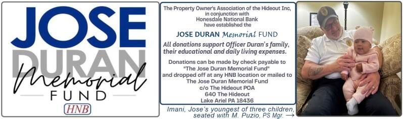 But soon after the GoFundMe account went online, the Hideout POA announced that it, too, was collecting money under the “José Duran Memorial Fund." Checks could be made payable to the Fund and dropped off at the Hideout Association of Property Owners (POA) office or Honesdale National Bank.